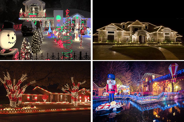 Package D: $1850-Door Decor (We Deck Your Door! Choose Garland, Wreaths, or Potted Plant lighting)-Pathway lighting floor to driveway -LED yard decor -Bushes/trees 6' or below (up to 6) -Single-floor columns (up to 6) -1st floor windows (up to 4) or extra LED yard ldecpot -1st Floor gutterline and gables -Branch wrap of 1 trees/bush 15' and below -Upper floor roof line - gutterline, gables, dormer windows -Upper floor windows (up to 4) |